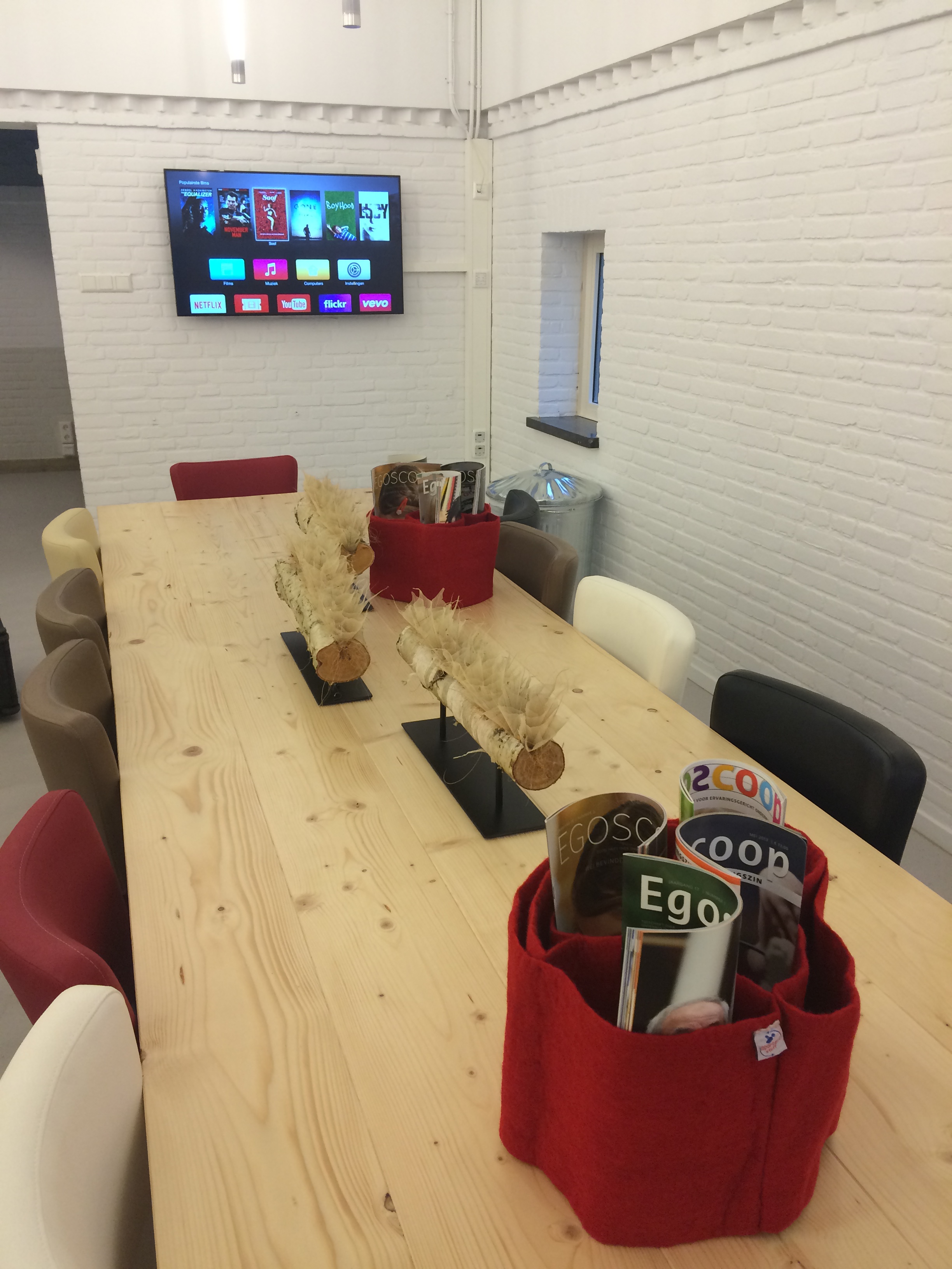 Meet to Create ruimte ingericht met audiovisuele middelen. Narrowcasting schermen bij de entree. Open overlegruimte met koppeling met Meettocreatruimte.
